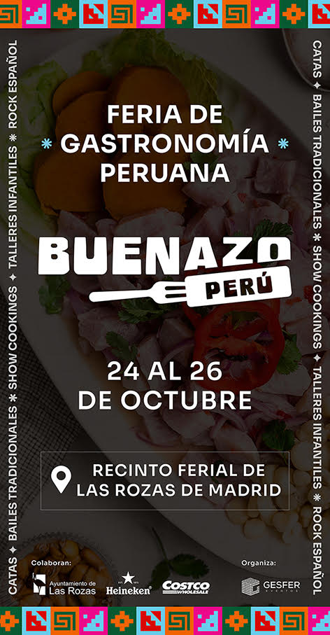 Bienvenidos a la gran fiesta de la cocina peruana. El Recinto Ferial de Las Rozas (Avenida Nuestra Señora del Retamar, s/n) acoge la primera edición de Buenazo Perú, del viernes 24 al domingo 26 de octubre. 11 de los mejores restaurantes peruanos de Madrid Capital se reúnen por primera vez para cocinar al momento sus nuevas propuestas y platos emblemáticos, acompañados de entrantes y postres. Participan La Morocha y Sakura Maru, del reconocido chef Giancarlo Cortez; Xolo Nikkei, con Mauricio Guevara; Rocoto, con Freddy Andia; Hoku, con Renzo Gayozo; Terwalls Parrilla y Sal y Salinas, con Walter Salinas; además de Mamá Nena, Paradero Perú, Rincón Peruano y Tambo.