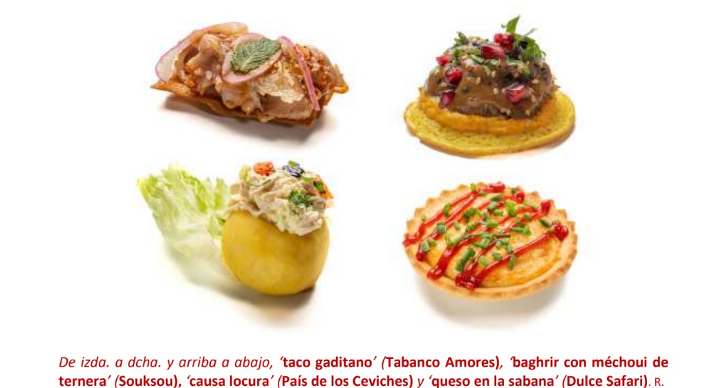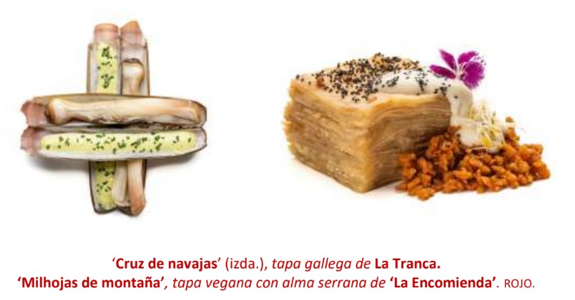 Nuestro mapa regional navega de lo castizo al nomadismo, del arraigo al terruño a la experimentación. Así, muchas de las 28 tapas españolas recuperan recetas caseras y sabores de siempre, como la ‘cruz de navajas’ de La Tranca (Mercado de San Fernando), de tierna navaja gallega cocida al punto, servida con mojo verde; mientras que otras transforman la cocina de proximidad en viajes interculturales, del respeto a lo autóctono al desarraigo absoluto en fusiones canalla (el ‘taco gaditano’ de Tabanco Amores, relleno de chicharrón, queso de tetilla, yema, shichimi y soja) y formatos audaces (el cucurucho ‘la mancheguita’ de La Chulapa en Mayrit, con pisto con garbanzos, chorizo y huevo duro).
