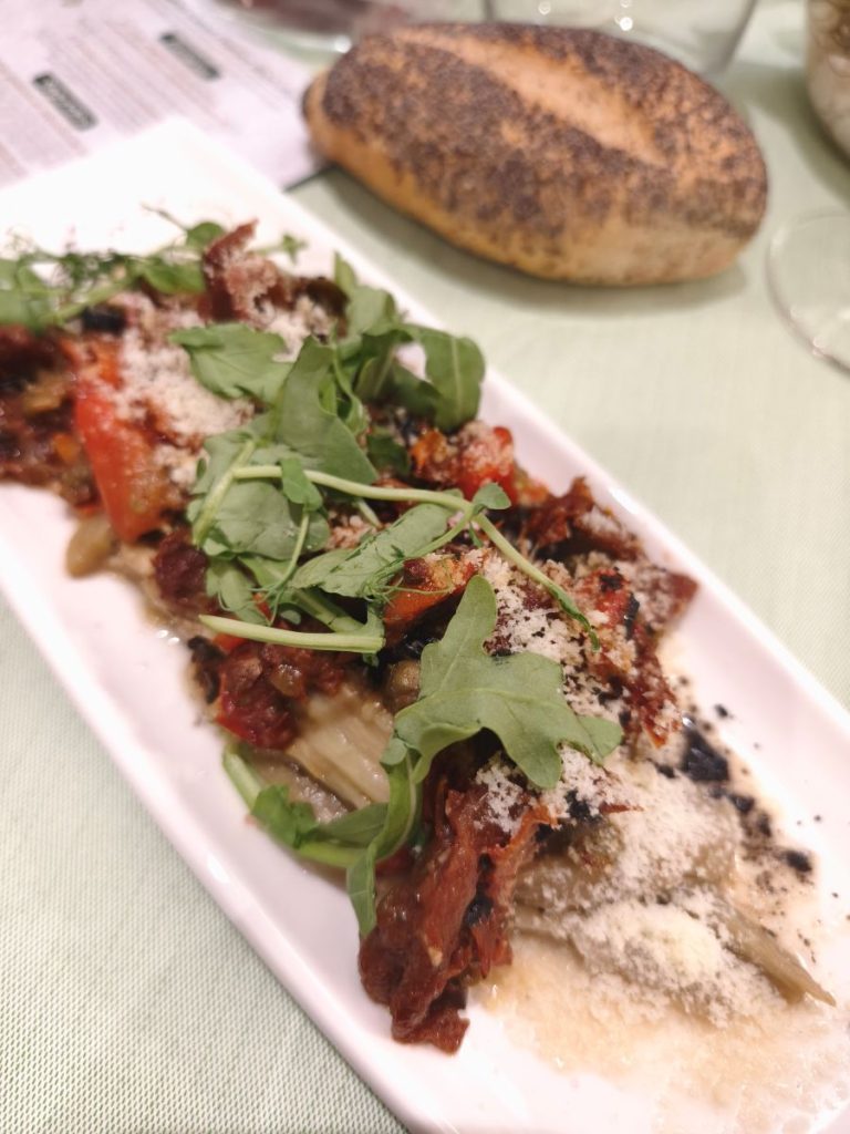 En el restaurante Ecocentro (Calle Esquilache,4, Madrid) pudimos elegir, de primero, entre el tataki vegetal de tofu ahumado y las berenjenas en pickie mediterráneo.