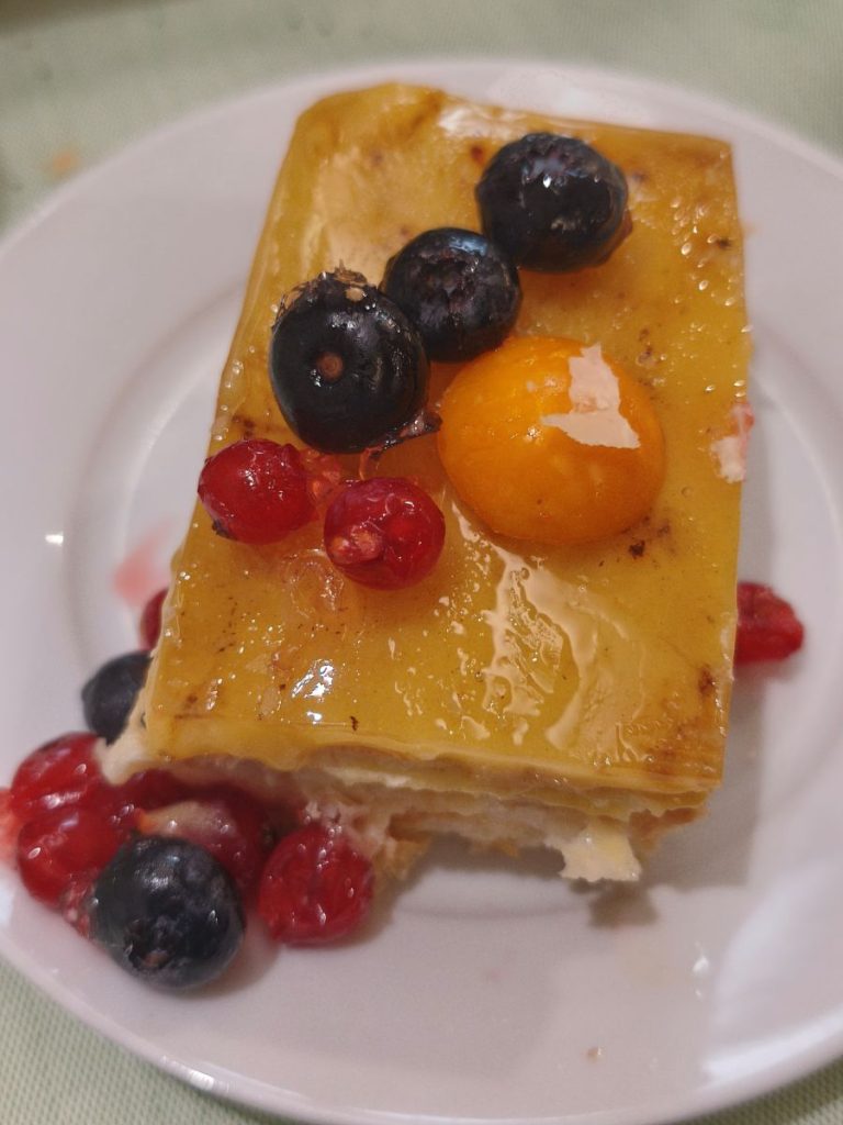 De postre, o cremoso de coco y cacao o delicia de hojaldre con yema tostada.