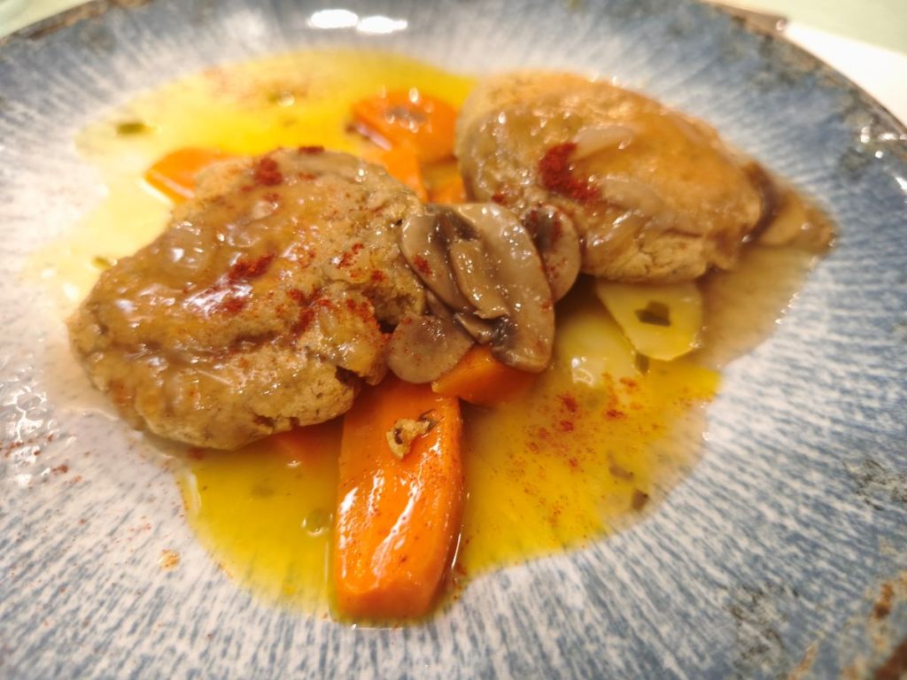 De segundo, entre el seitán glaseado y el medallón de lentejas en salsa veleute con champiñones.