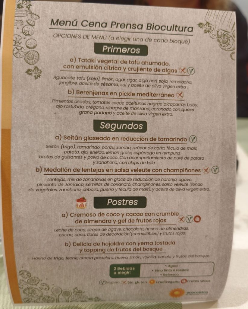 En los discursos oficiales, se habló del nuevo acento profesional que tiene BioCultura Madrid 2025 a la búsqueda del crecimiento del sector ecológico español, hasta ahora más exportador que otra cosa. Se comentó también el desastre que puede suponer para el sector ecológico el “greenwashing” de esa supuesta nueva agricultura sostenible, que ni es agricultura ni es perdurable. Estuvieron representantes de ASOBIO (Pol Picazos, Eva Roger), Ecovalia (Álvaro Barrera), INTERECO (Regina Monsalve), SEAE (Pilar Galindo), la propia Vida Sana (organizadora de BioCultura)… También asistieron delegados de algunos comités de agricultura ecológica de diversas comunidades autónomas españolas (Asturias, Madrid, Navarra…) y, por vez primera en estas cenas ya tradicionales, algunos influencers del sector ecológico… Nadie quiso perdérselo.