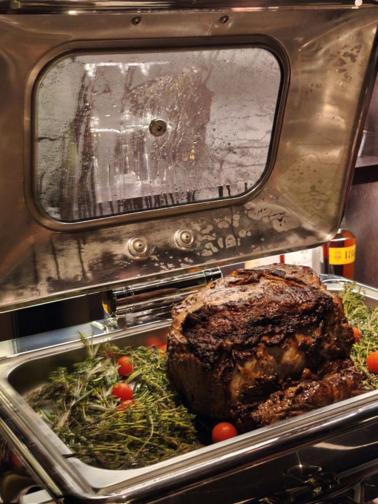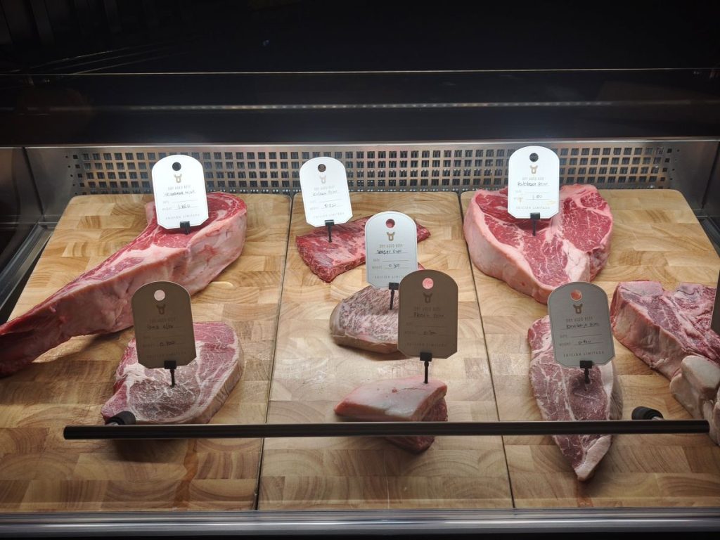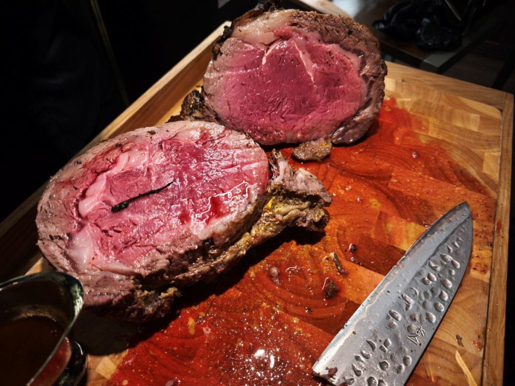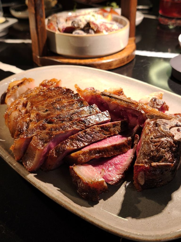 El concepto de este restaurante madrileño va más allá de un steakhouse. No se trabaja con una parrilla tradicional, sino con un horno Broiler (que nosotros hemos podido ver) que alcanza los 560 – 600ºC, garantizando una jugosidad y sabor incomparables y manteniendo el sabor original de la carne, sin ahumados, ni matices que puedan disfrazar su excelente calidad como la Black Angus Prime, cuya categoría representa solo el 2 o 3 por ciento de todo el ganado Angus.