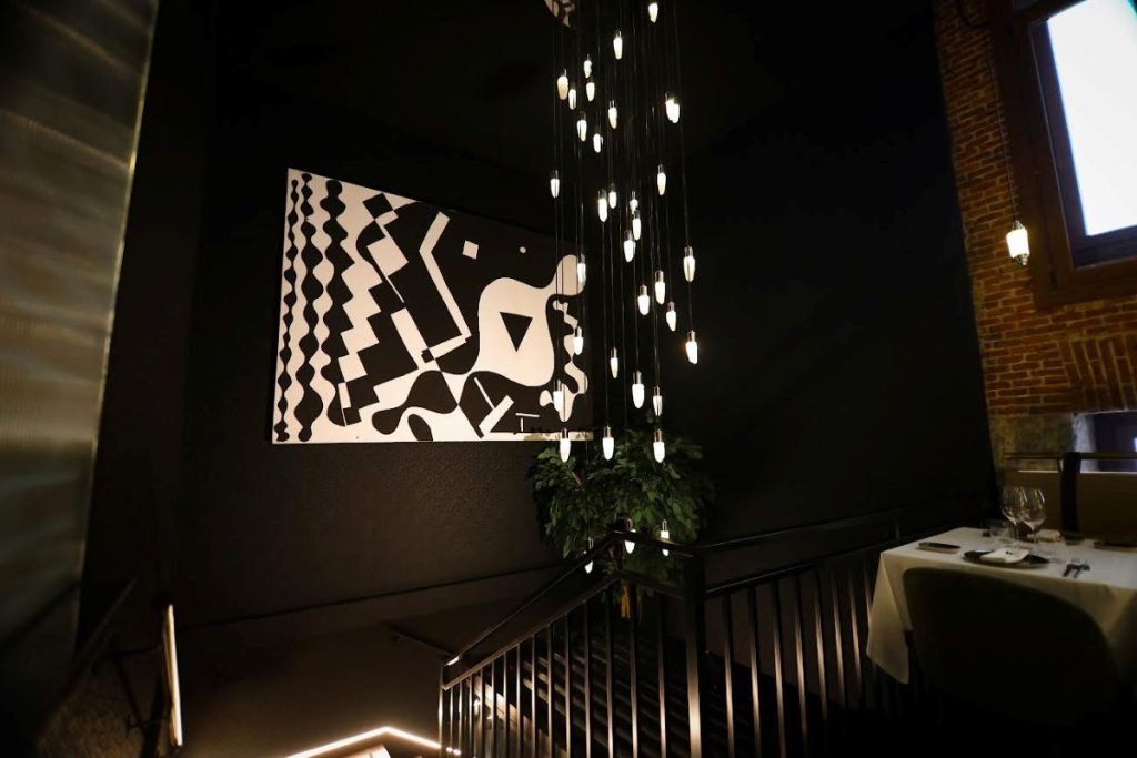 Sus lámparas son piezas artísticas de cuarzo creadas por la firma peruana Amaminerali, esculturas de luz y joyería, trabajadas a mano por un equipo de artesanos especializados en minerales, con un compromiso claro con la riqueza geológica del Perú, convirtiéndolos en esculturas de diseño con alma propia. En La Cuadra de Salvador no sólo la carne se hace arte… El restaurante está situado en la calle de Los Madrazos, donde vivieron algunos de los famosos pintores de esta saga familiar de tres generaciones. Y precisamente de pintura en el restaurante La Cuadra de Salvador también podemos hablarte. En diferentes rincones se exhiben cuadros de Miguel Ángel Campano, uno de los mejores pintores impresionistas españoles. Destaca de manera especial la obra elegida para presidir la escalera del restaurante, que estuvo expuesta en el Museo Reina Sofía.