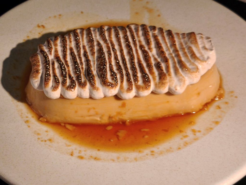 Cúpula de merengue seco, rellena de dulce de leche y guanábana, sobre base de bizcocho húmedo (versión peruana de flan, elaborada con dulce de leche y merengue al Oporto).