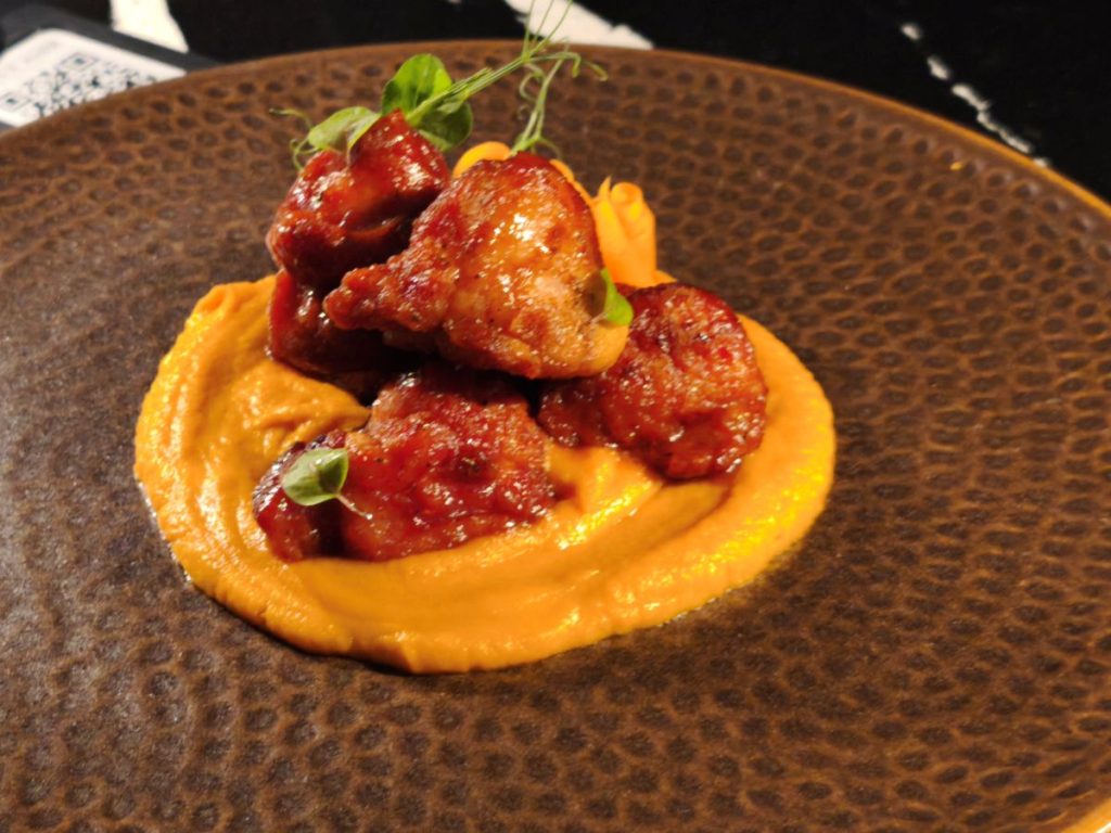 Mollejas crocantes, bañadas en miel de rocoto (un pimiento andino) y jengibre, puré y encurtido de zanahoria. Deliciosas y uno de los platos estrella de la casa. Cuando las pruebes comprenderás el motivo.
