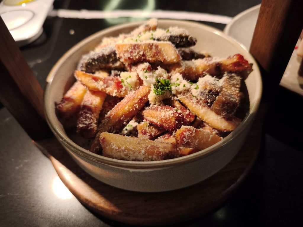 Patatas andinas, de colores, tradicionales de Perú, fritas, con queso parmesano, sal trufada y cebollino. Los colores de las patatas dependen de la proximidad del mar. Servidas con ají amarillo y chimichurri de huacatay. Buena está la carne, soberbia, pero no pierdas de vista estas patatas… - También pimientos y espárragos verdes.