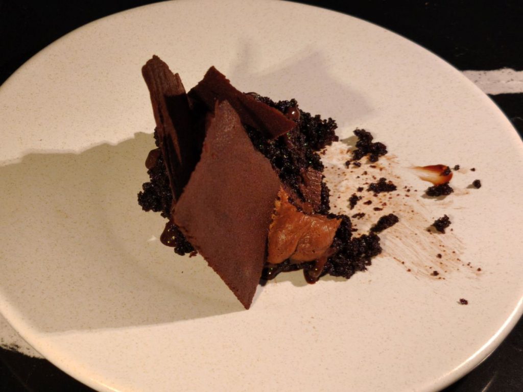 Bizcocho de chocolate húmedo, salsa de chocolate, mousse de chocolate y tulipa de chocolate.