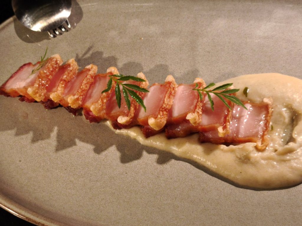 Clásicos torreznos con puré de tubérculos andinos con pesto de perejil y huacatay.