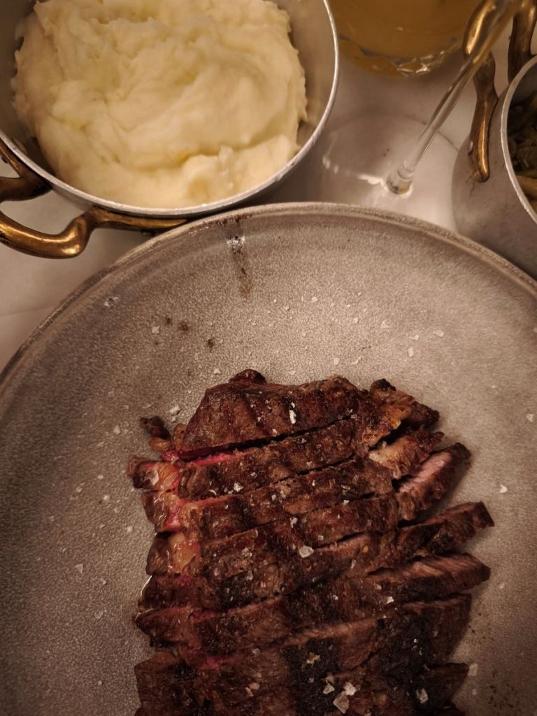 - Rib eye con guarniciones: puré de patata, frijolitos de olla, rajas de chilaca