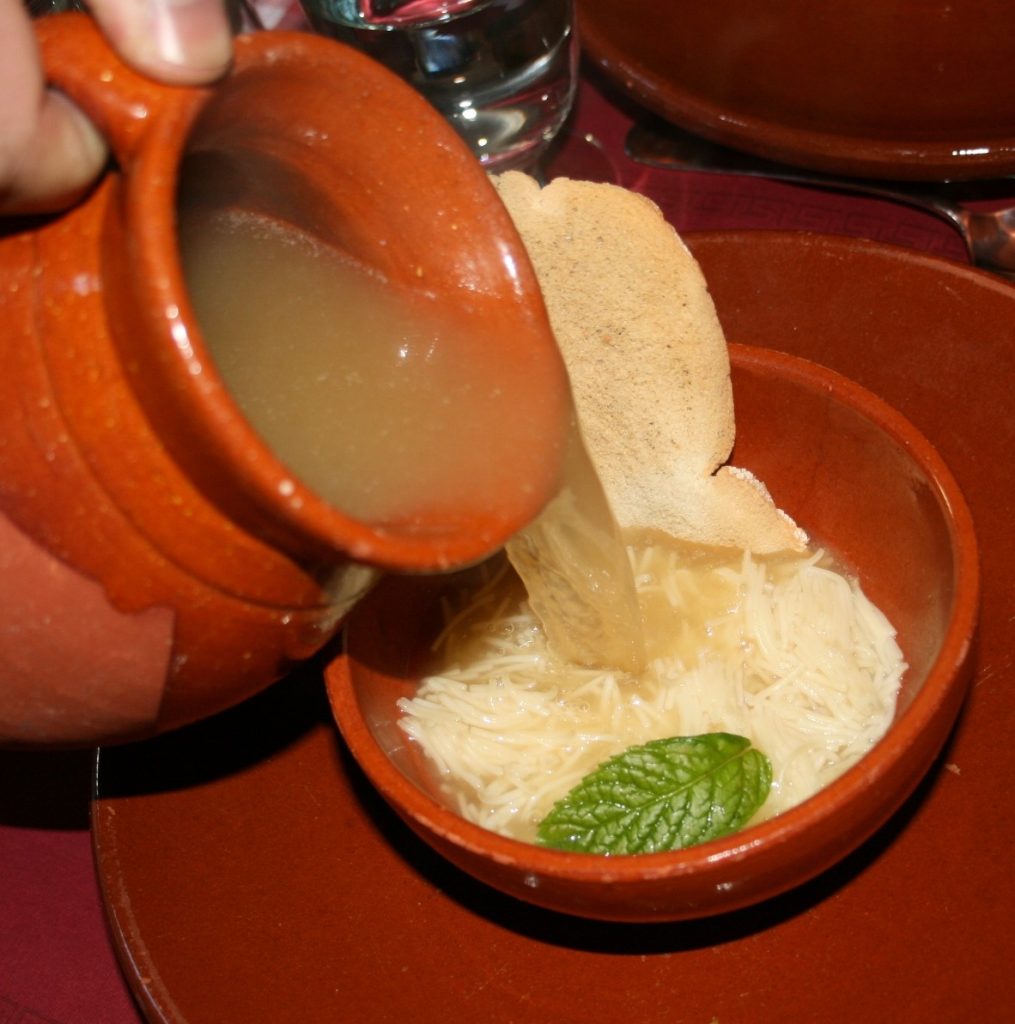 6 Por último hacer la sopa con el caldo y los fideos. Cuando hierva el caldo y añadir los fideos, dejar cocer 3-4 minutos (comprobar el punto del fideo de vez en cuando para no cocerlos en exceso, dependerá del tamaño del fideo). Rectificar el punto de sazón si es necesario. Al final de la cocción añadir los rellenos y dejarlos cocer unos instantes. Unas ramitas de hierbabuena le dan un sabor muy especial a la sopa.